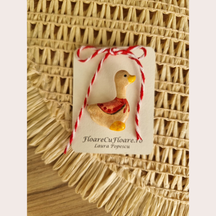 Această broșă mărțișor este realizată manual din lut ceramic cu uscare la aer, modelată cu grijă și atenție la fiecare detaliu. După uscare, piesa este pictată manual, ceea ce face ca fiecare broșă să fie unică. Finisajul lucios din rășină îi oferă un aspect elegant, intensifică culorile și asigură o protecție suplimentară în timp.