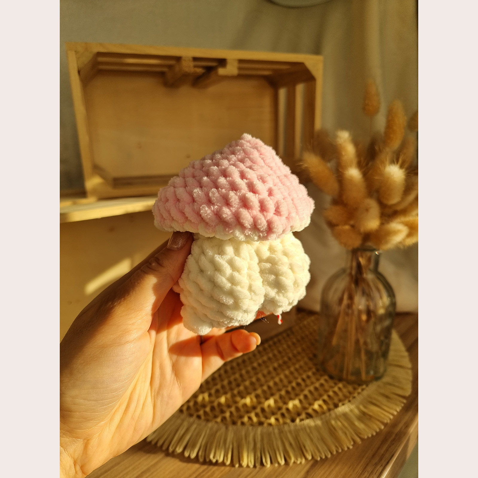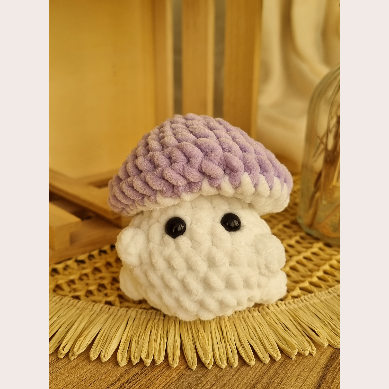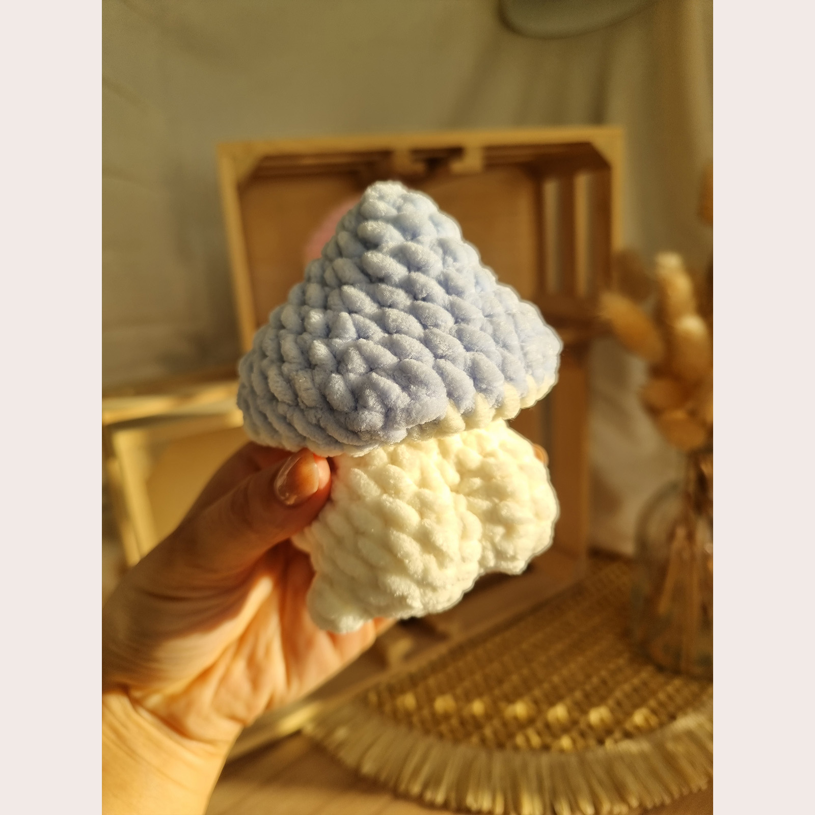 O ciupercuță croșetată manual, gata să aducă zâmbete cu surpriza ei amuzantă: la spate are un fund simpatic! Este perfectă pentru cadouri haioase sau decor cozy în cameră. Se poate realiza pe orice culoare – te rugăm să specifici culoarea dorită atunci când plasezi comanda.