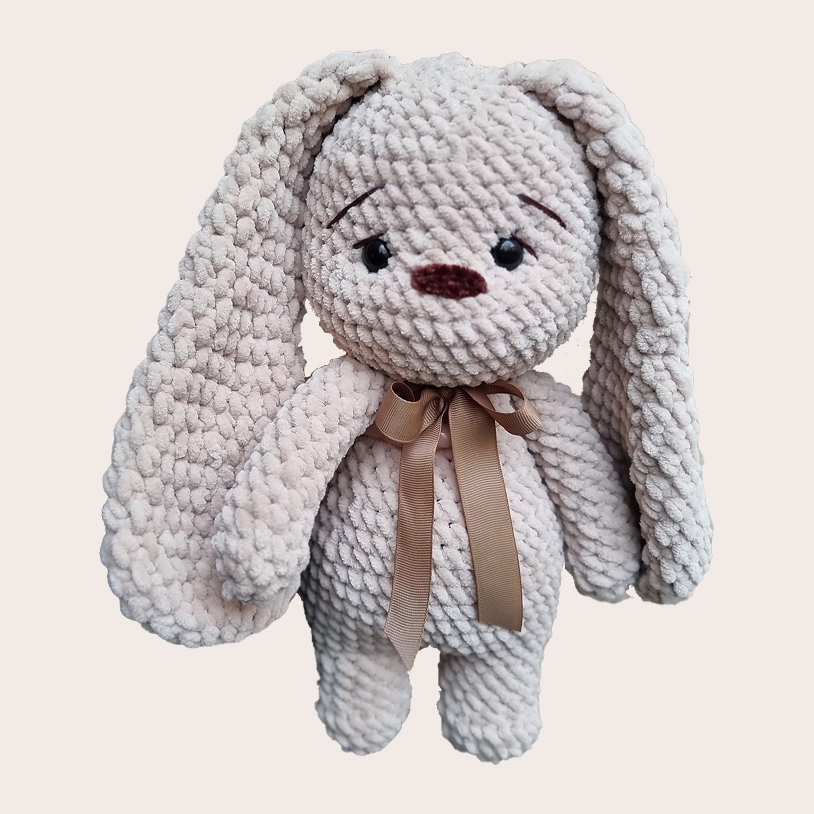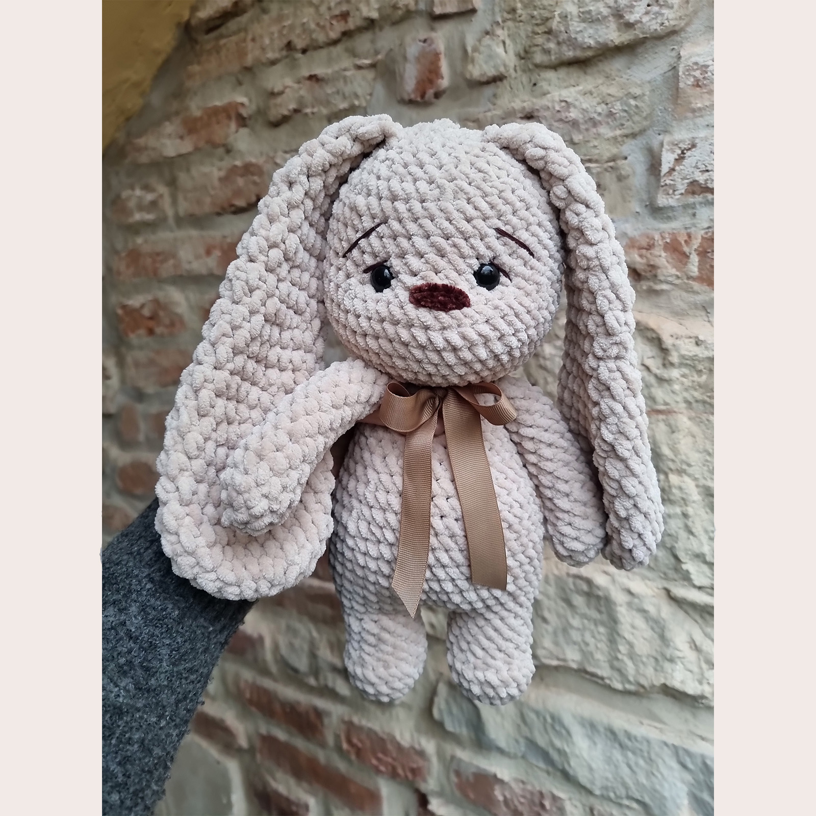 Iepuraș croșetat manual din fir moale de catifea, cu umplutură specială pentru jucării, hipoalergenică. Ochii sunt prinși cu dispozitiv de siguranță pentru copii.