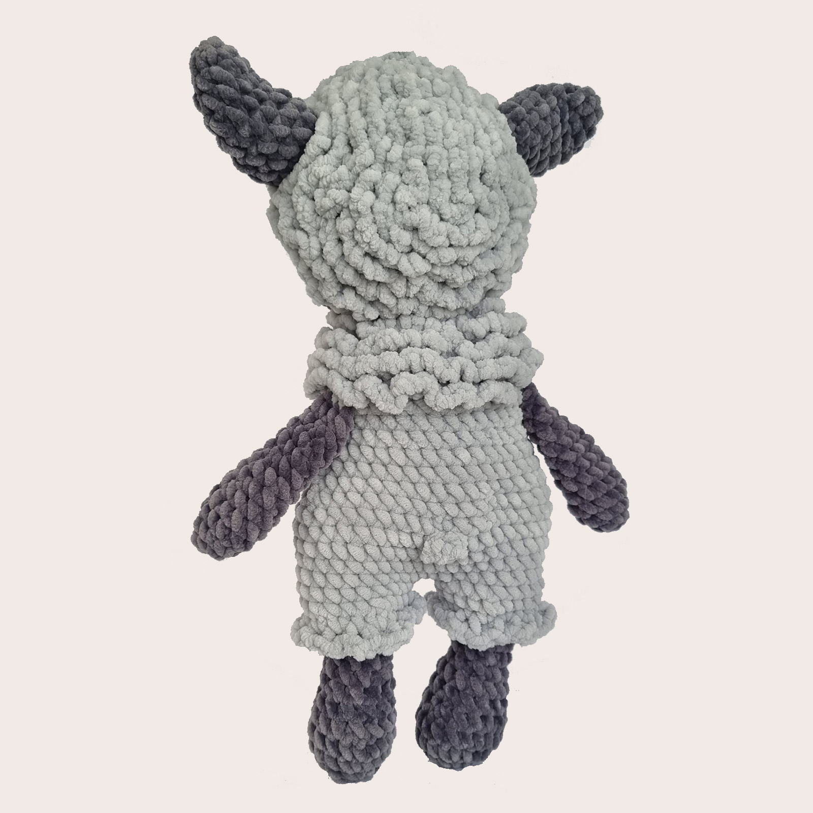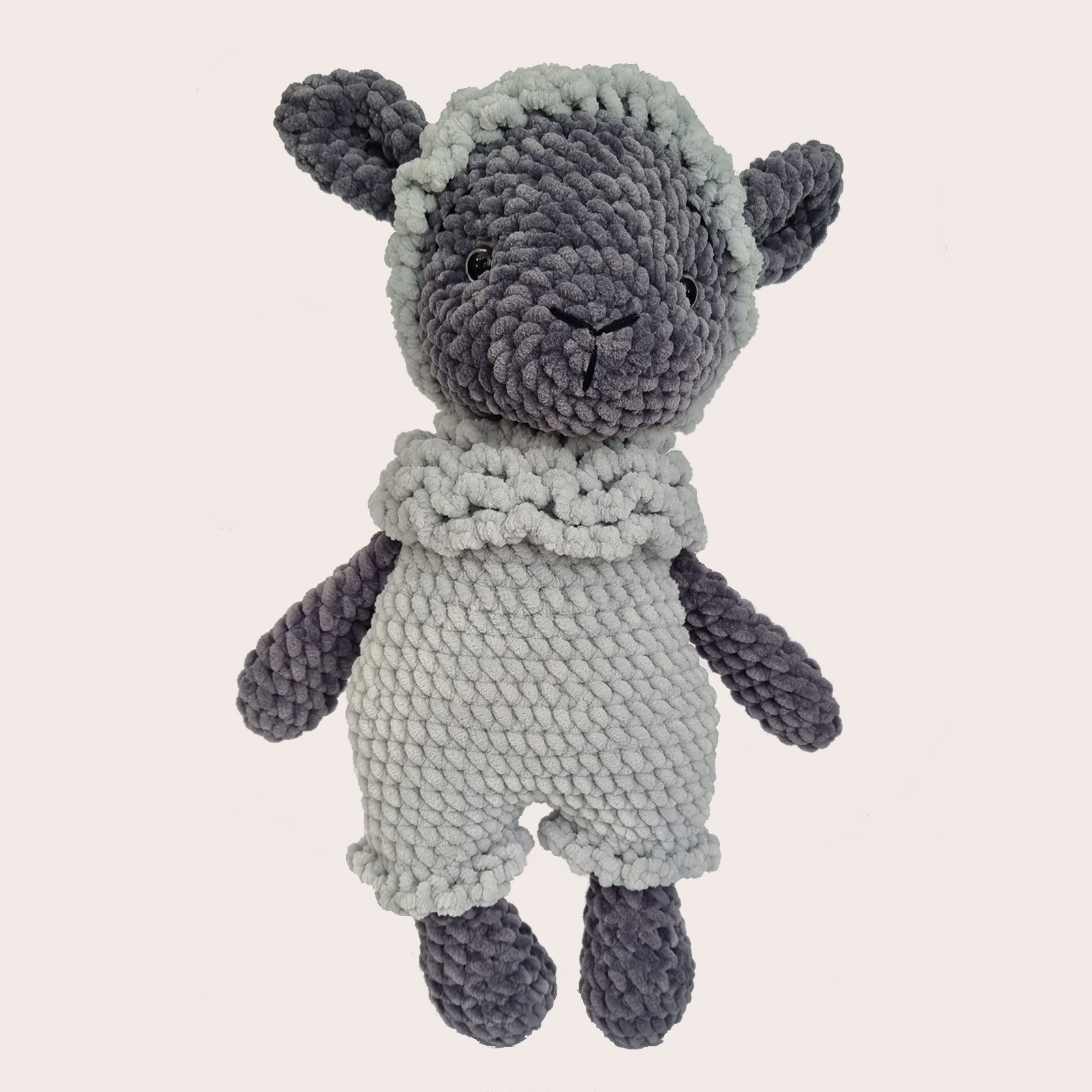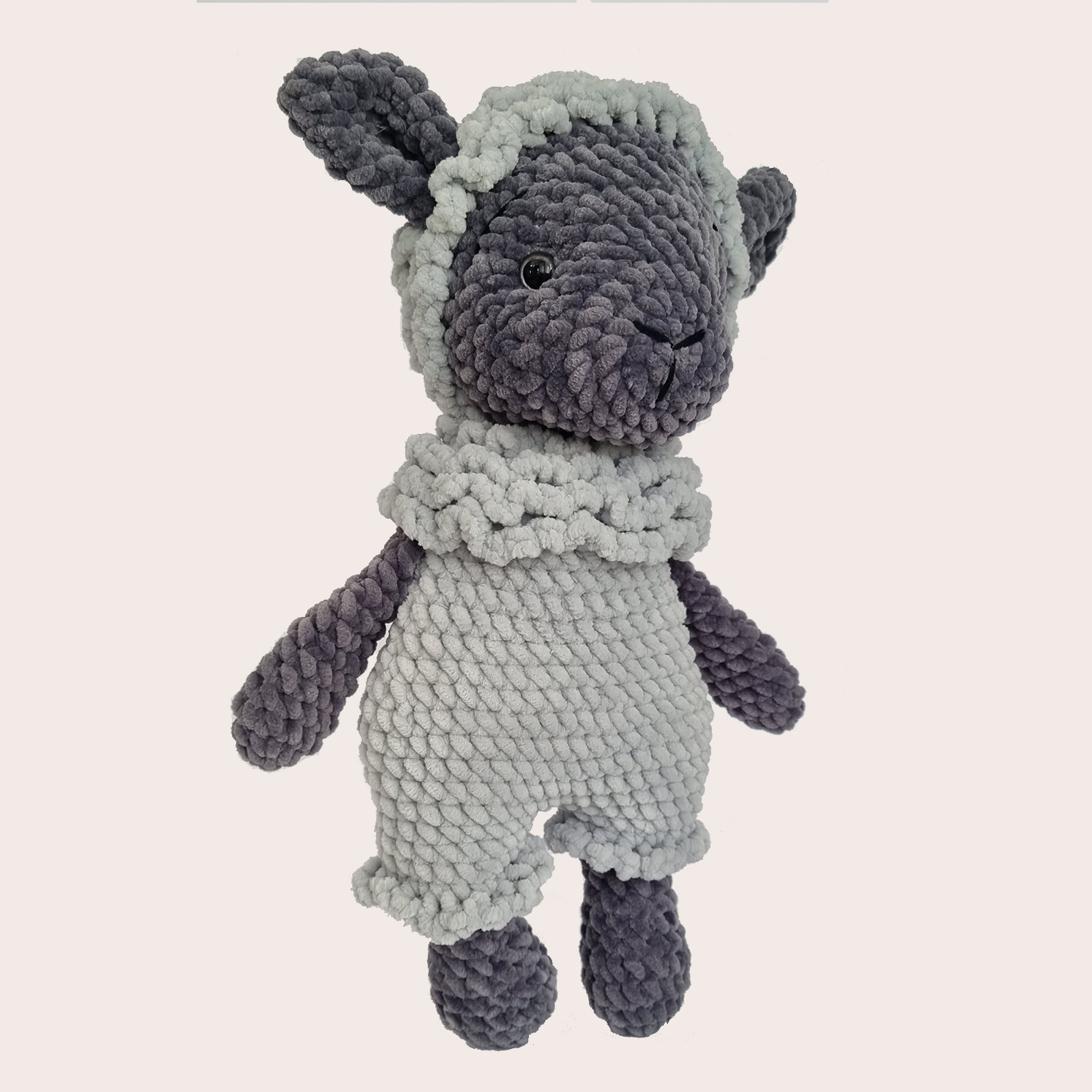Oaie croșetată manual din fir moale de catifea, cu umplutură specială pentru jucării, hipoalergenică. Ochii sunt prinși cu dispozitiv de siguranță pentru copii.