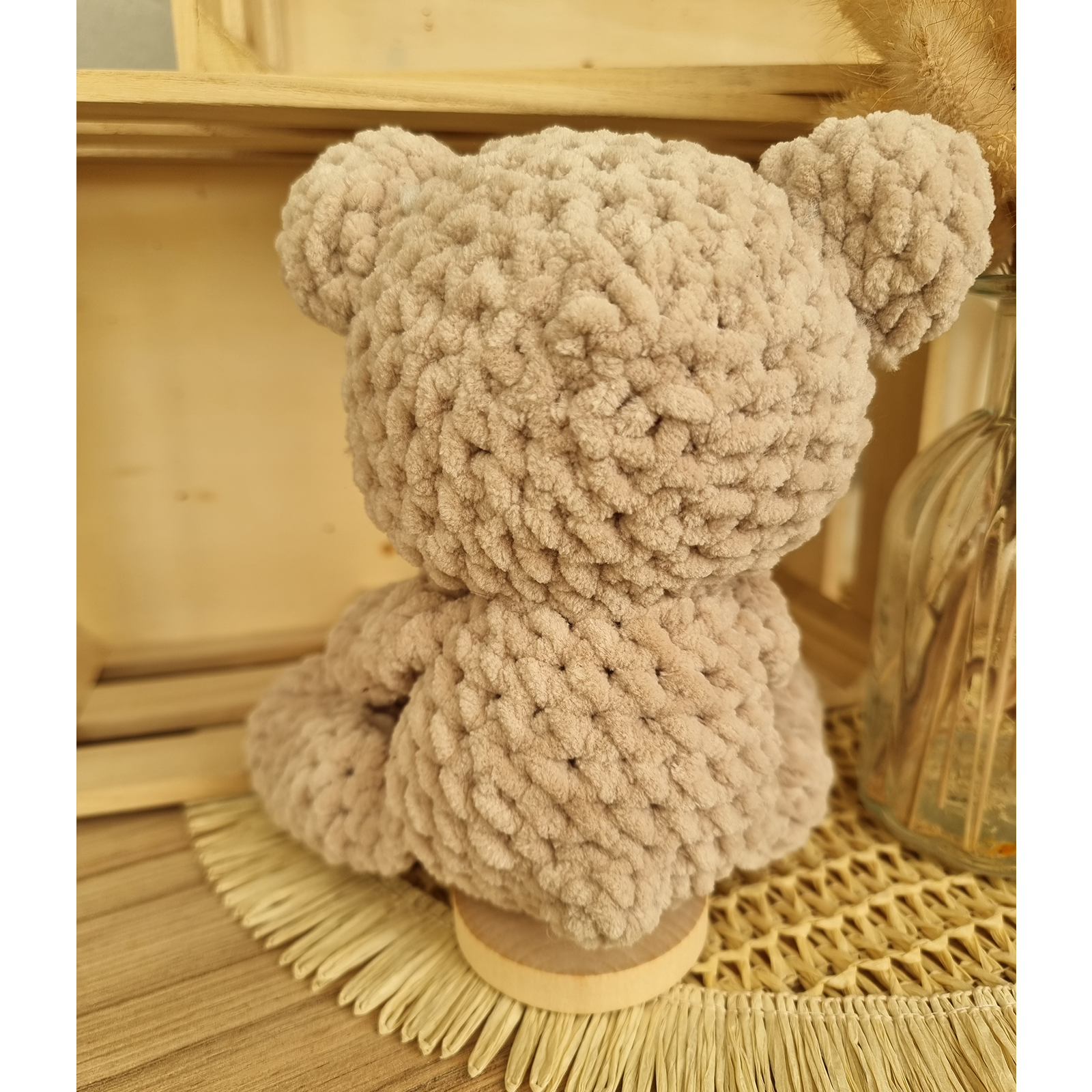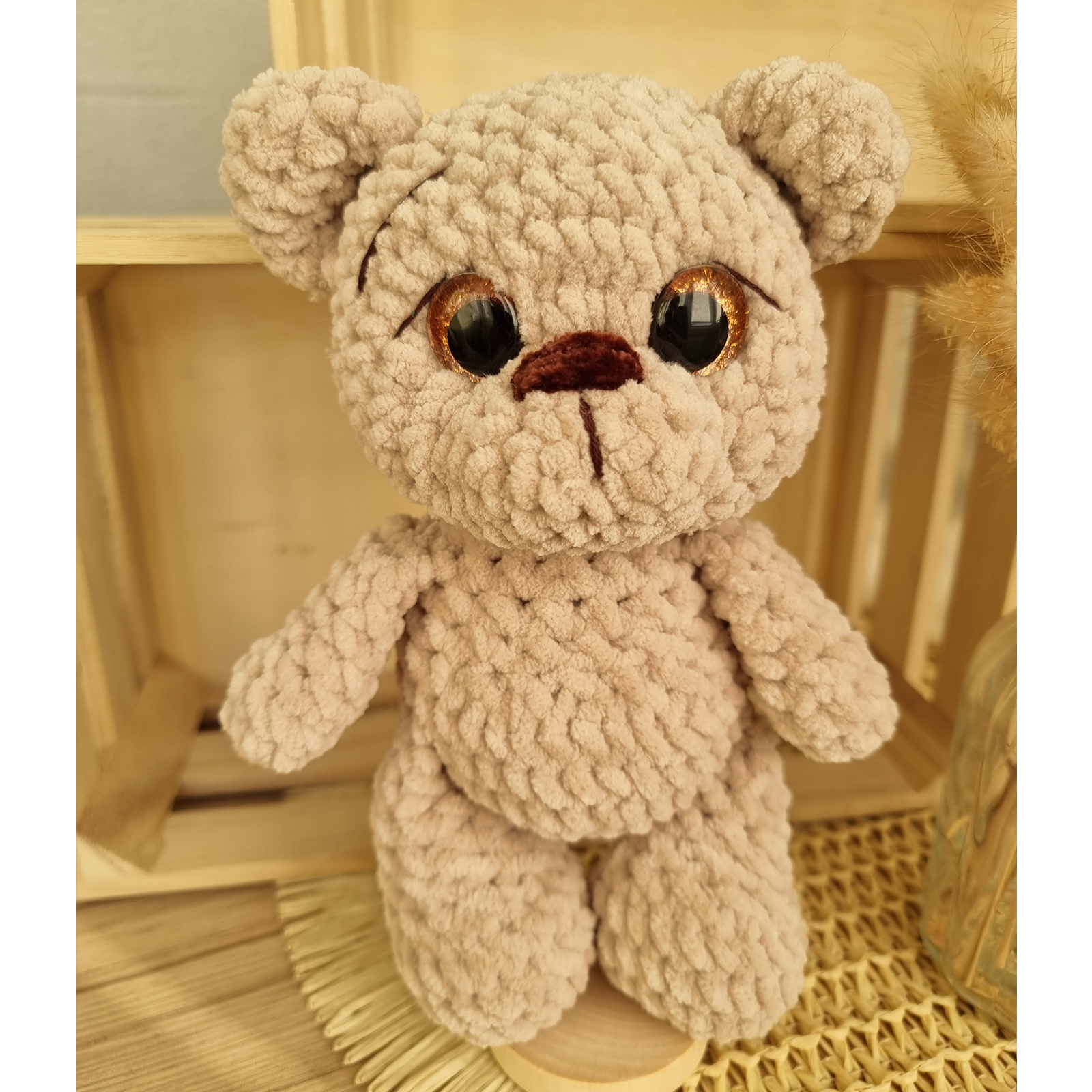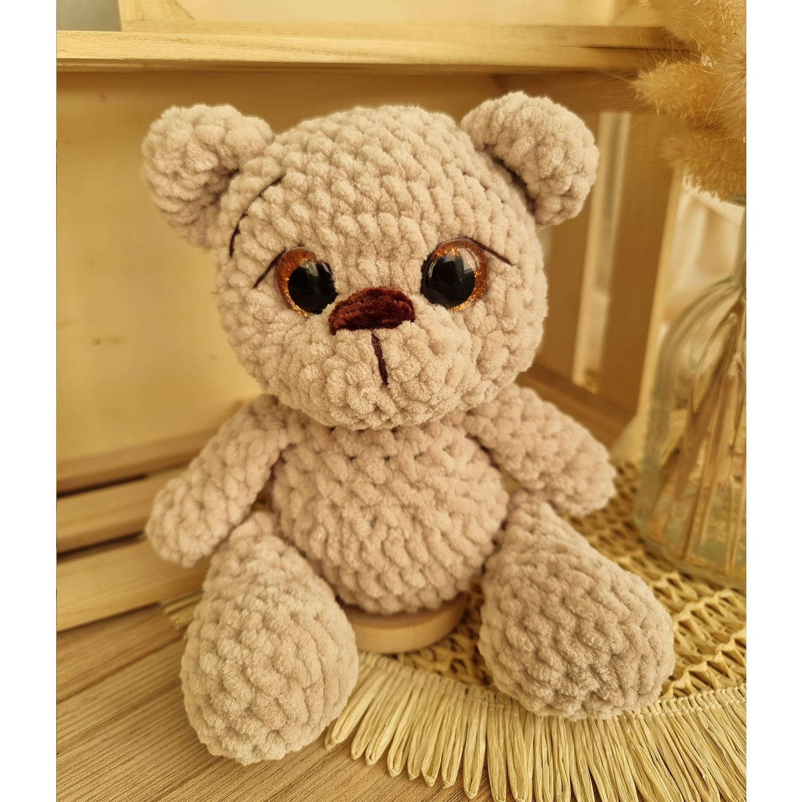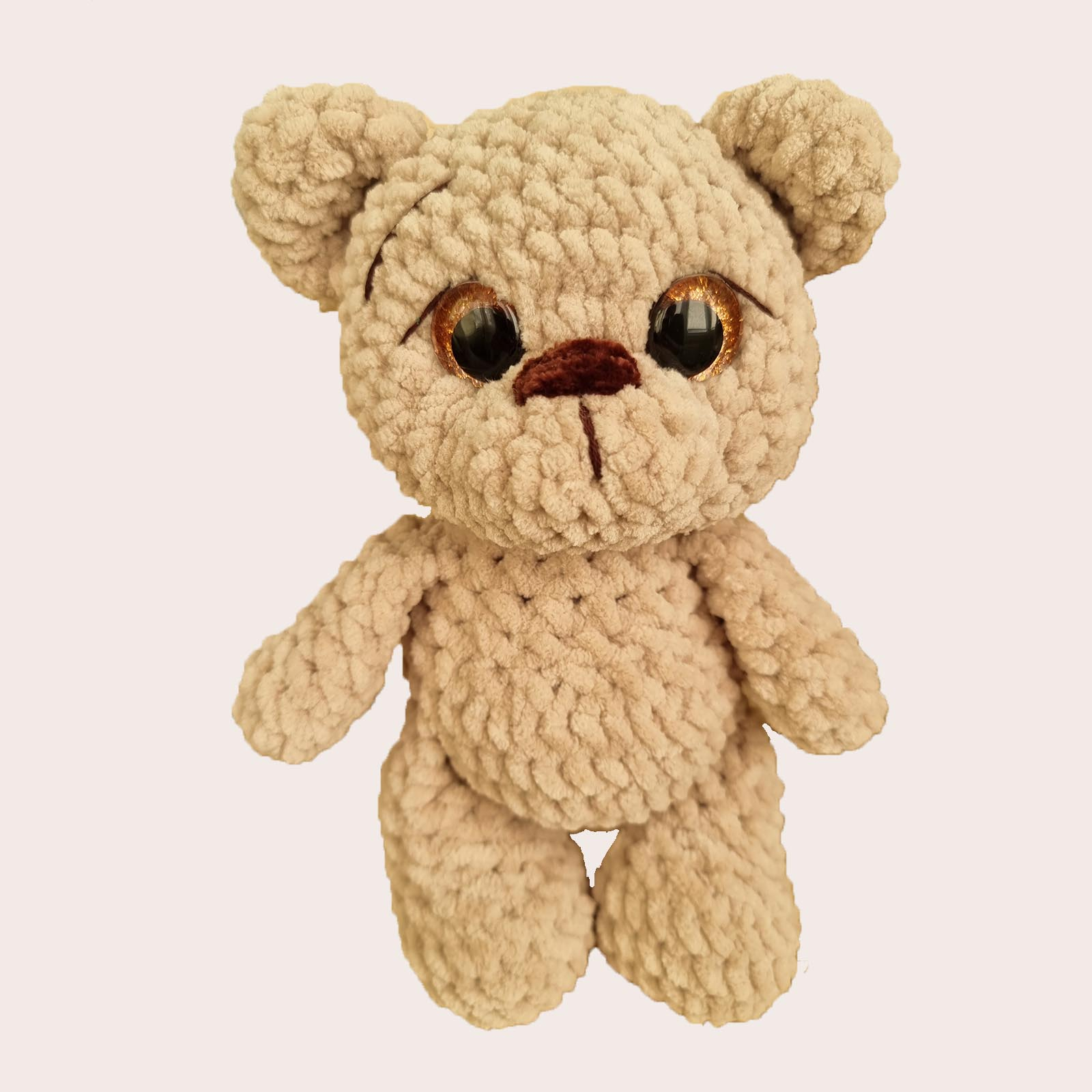 Ursuleț croșetat manual din fir moale de catifea, cu umplutură specială pentru jucării, hipoalergenică. Ochii sunt prinși cu dispozitiv de siguranță pentru copii.