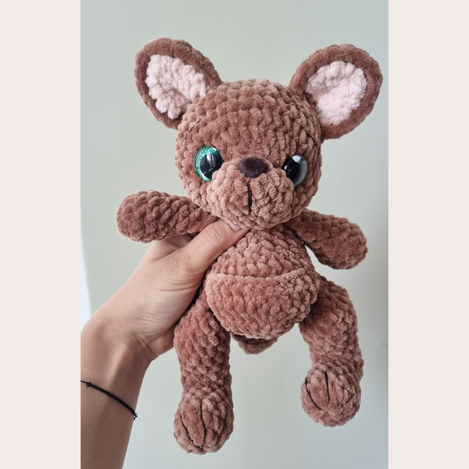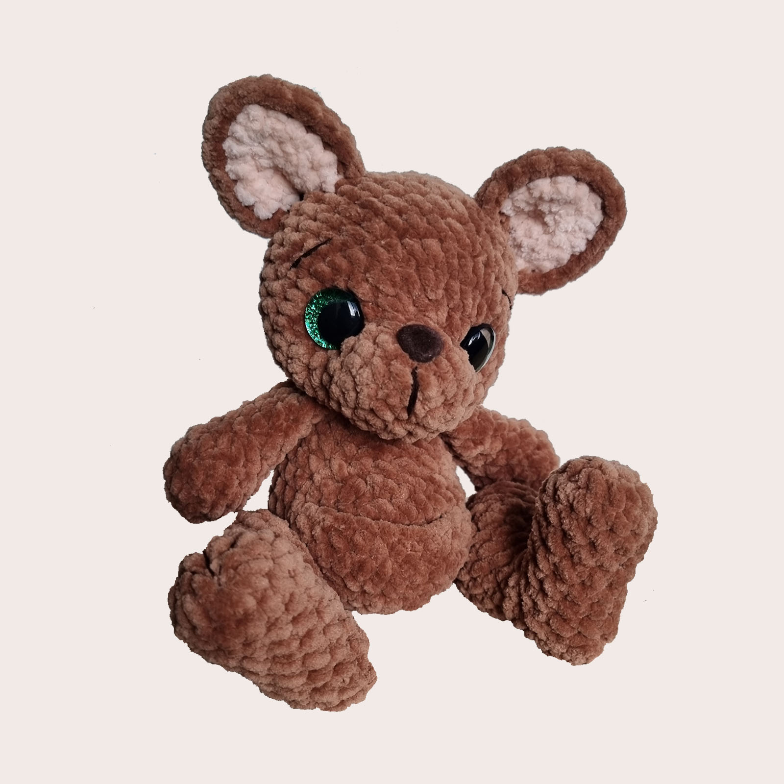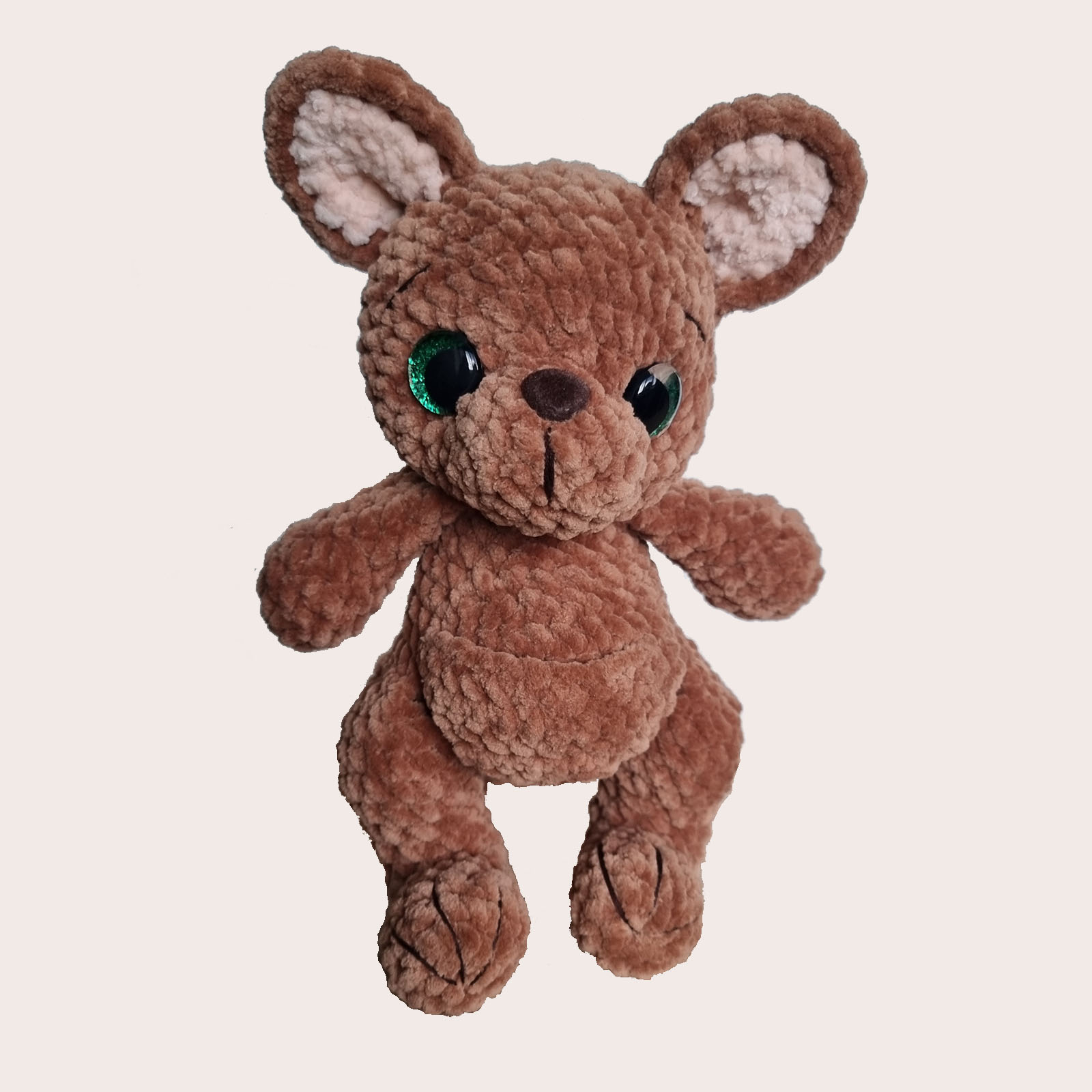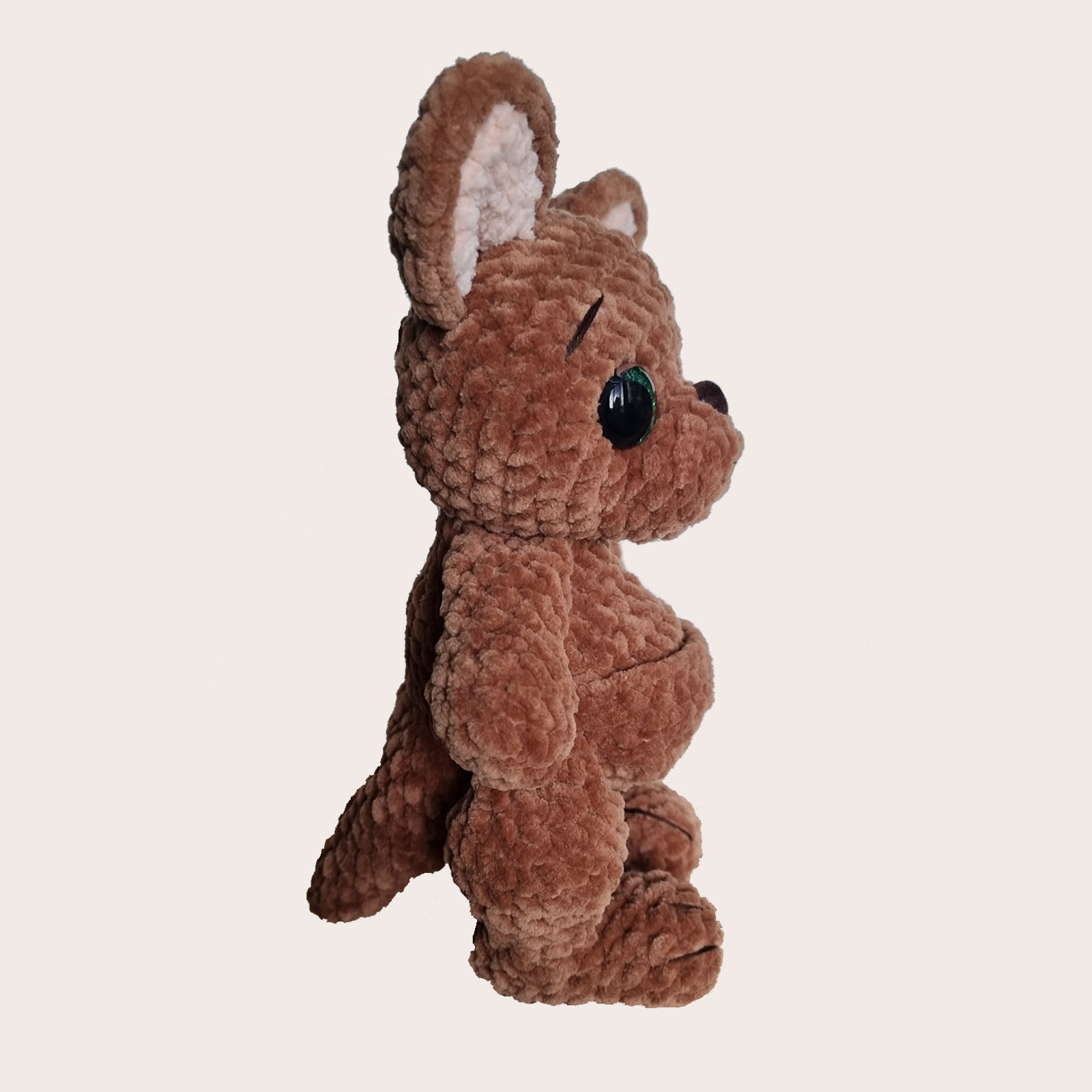 Cangur croșetat manual din fir moale de catifea, cu umplutură specială pentru jucării, hipoalergenică. Ochii sunt prinși cu dispozitiv de siguranță pentru copii.
