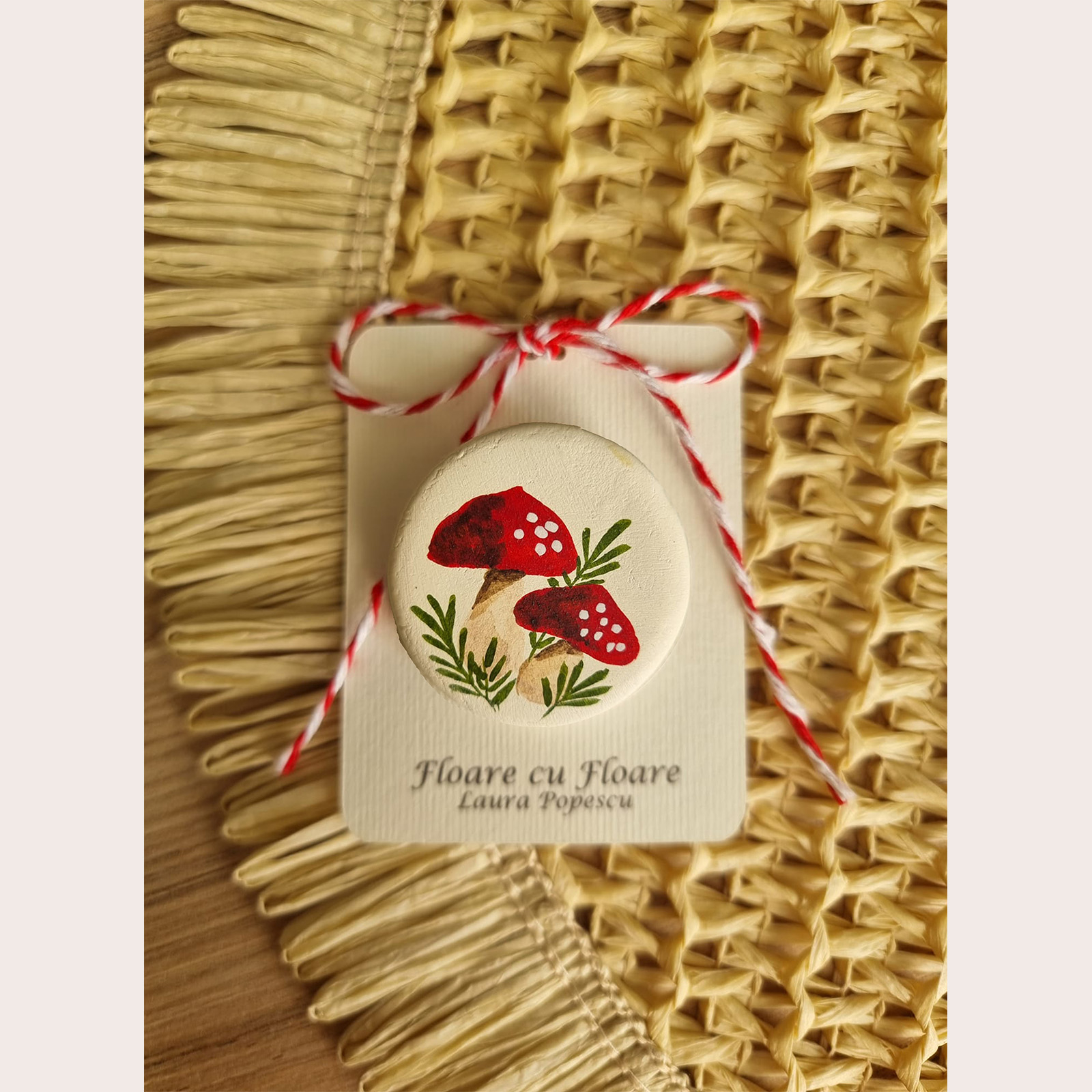 Mărțișorul este realizat din lut cu uscare la aer, un material ușor de modelat, care, după uscare, devine solid și rezistent. După modelare, piesele sunt lăsate să se usuce complet, apoi sunt șlefuite pentru a obține o suprafață netedă. Urmează pictarea, cu acuarele.. La final, mărțișorul este lăcuit pentru protecție și pentru a conferi un finisaj mat, cât mai natural, sporindu-i durabilitatea.