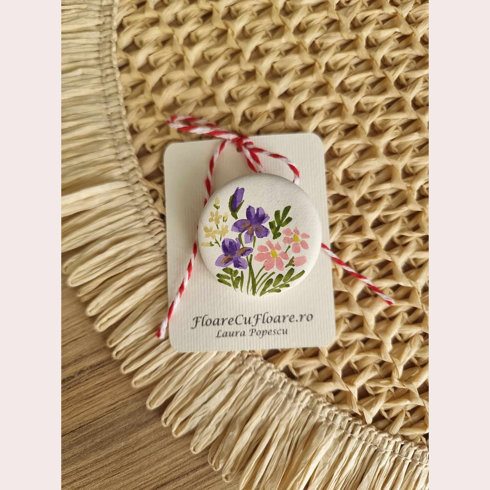 Mărțișorul este realizat din lut cu uscare la aer, un material ușor de modelat, care, după uscare, devine solid și rezistent. După modelare, piesele sunt lăsate să se usuce complet, apoi sunt șlefuite pentru a obține o suprafață netedă. Urmează pictarea, cu acuarele.. La final, mărțișorul este lăcuit pentru protecție și pentru a conferi un finisaj mat, cât mai natural, sporindu-i durabilitatea.