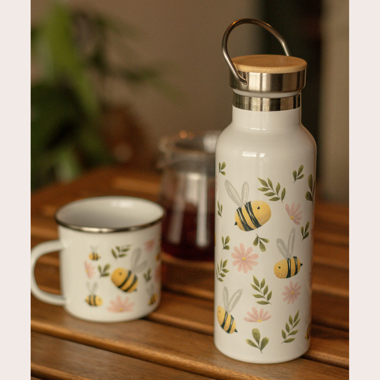 Termos modern, realizat din oțel inoxidabil cu perete dublu pentru izolare termică eficientă. Are o capacitate de 500 ml, ideală pentru utilizarea zilnică. Capacul este fabricat din bambus durabil, iar mânerul metalic asigură un transport facil. Designul este completat de un imprimeu floral decorativ, care adaugă un plus de stil oricărui moment de pauză.
